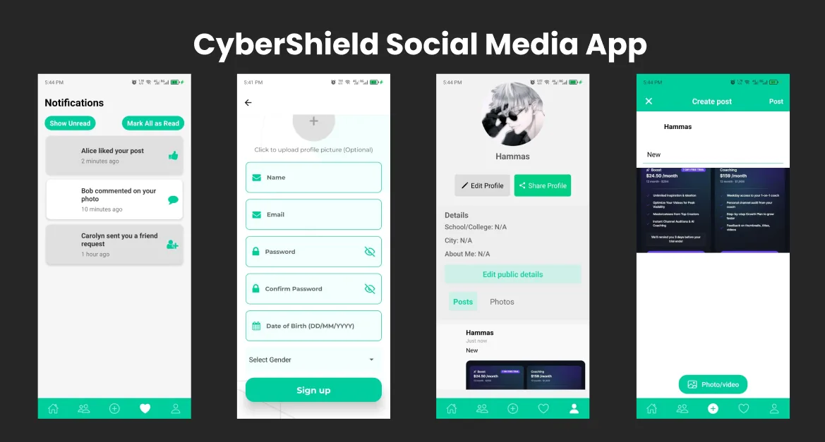 CyberShield is a full-stack social media platform designed to provide a secure and feature-rich networking experience. It enables users to create profiles, connect with friends, share posts, join groups, send messages, and receive real-time notifications.